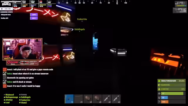 01:59:31Zu Beginn des Zeitstempels wird die strategische Planung für einen Raid auf eine frisch gegriffene Garage besprochen. Der Streamer analysiert die Verteidigungsanlagen, die hauptsächlich aus Metallbarrikaden bestehen, und plant, diese mit Raketen zu durchbrechen. Es werden verschiedene Ansätze diskutiert, darunter der Einsatz von Miniguns, C4 und Satchel-Charges. Die Situation wird als sehr anstrengend und riskant eingestuft, da viele Vending-Machines im Inneren erwartet werden und Face-Checks drohen.