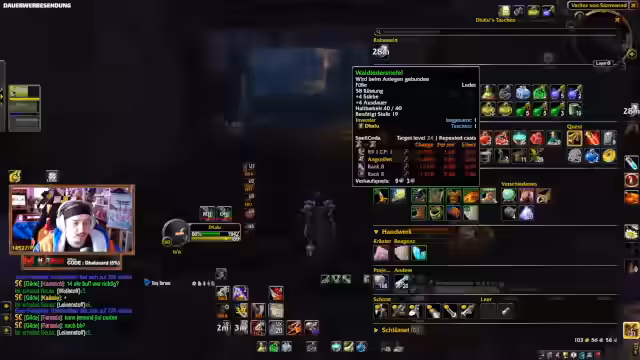 00:05:59Es geht um das Ziel der Gildenleitung, den sozialen Kontakt innerhalb der Gilde zu fördern und verschiedene Leute für Dungeons und Quests zusammenzubringen. Der Streamer erklärt, wie er grüne Gegenstände an andere Spieler in der Nähe weitergibt. Zudem wird über die Vorbereitungen für Raids gesprochen, bei denen Berufe wie Alchemie und Kräuterkunde besonders wichtig sind.