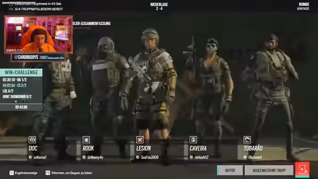 06:01:40Es werden Versprechen für den Fall eines Sieges gemacht, darunter Essenseinladungen. Taktische Anweisungen werden gegeben, um die Positionen der Gegner zu bestimmen und die eigenen Teammitglieder zu unterstützen. Der Verdacht auf Cheating bei den Gegnern bleibt bestehen und wird immer wieder thematisiert. Es wird überlegt, wie man die Cheater austricksen und trotzdem gewinnen kann. Die Spieler versuchen, sich gegenseitig zu motivieren und den Fokus auf das Spiel zu behalten, trotz der Frustration über die unfairen Bedingungen. Es werden auch persönliche Anekdoten und Witze erzählt, um die Stimmung aufzulockern und den Teamgeist zu stärken. Die Spieler analysieren die Spielweise der Gegner und passen ihre Taktiken entsprechend an, um die bestmöglichen Chancen auf einen Sieg zu haben.