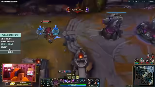 07:16:47Die Lobby gilt als sehr stark und schwierig zu gewinnen, mit Gegnern wie einem goldenen Vladimir. Der Streamer analysiert die Rollen der Champions und rät zu bestimmten Items wie dem Prismatischen Item. Das Ziel ist es, gegnerische Champions zu hemmen und so Leben wiederherzustellen. Ein plötzlicher Rückschlag reduziert das eigene Team auf ein verbleibendes Leben, was eine strategische Neuausrichtung erfordert.
