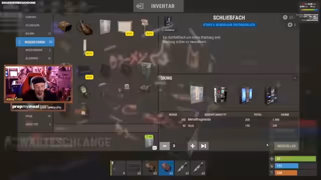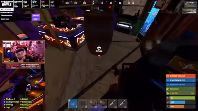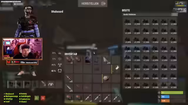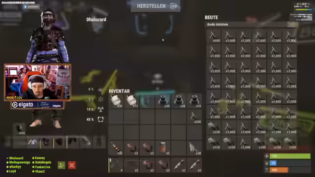 05:08:15Das Team füllt letzte Locker-Sets auf und priorisiert das Platzieren von Betten für die Raid-Vorbereitung. Diskussionen über notwendige Crafting-Mengen (z.B. 16 Raketenwerfer) und Ressourcen wie HV-Munition laufen. Zeitgleich plant das Team ein LAN-Event (1,2,7) und koordiniert die technische Umsetzung, z.B. mit Greenscreen in der Badewanne. Es wird betont, dass trotz Raid-Vorbereitung noch Zeit für Spaß bleiben muss. Letzte Anweisungen werden gegeben, um die Basis vollständig zu rüsten.