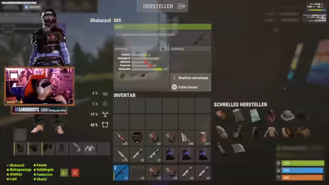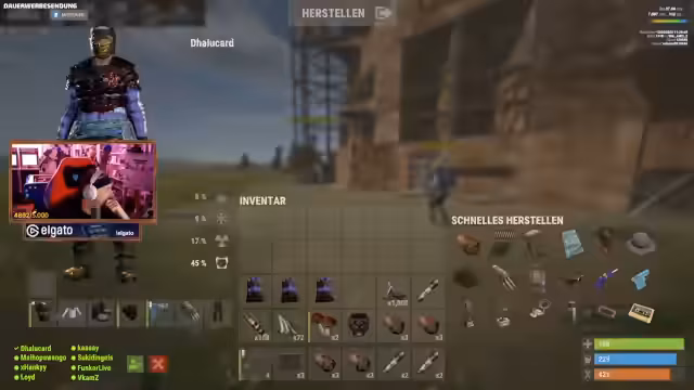 03:45:42Explosives und Scrap werden für geplante Raids verwaltet, während Kay plötzlich verschwindet. Interne Konflikte entstehen durch ungenutzte Crafting-Möglichkeiten und FPS-Probleme, die die Base-Verteidigung gefährden. Holz- und Metallknappheit wird thematisiert.