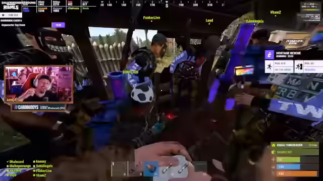 08:37:10Das Team sammelt zusätzliche Rockets und Munition für die Raid-Base. Ein Angriffshubschrauber wird als potenzielle Bedrohung erwähnt, und Launcher werden benötigt, um damit umzugehen. Spieler wie Rico und Barty werden koordiniert, um Tags (Punkte) in die Basis zu bringen. Gleichzeitig wird eine Positionierung links diskutiert, um Team Mendo 220 an der Ridge anzugreifen. Die Vorbereitungen laufen, während FPS-Probleme (Bildrate) auftreten.