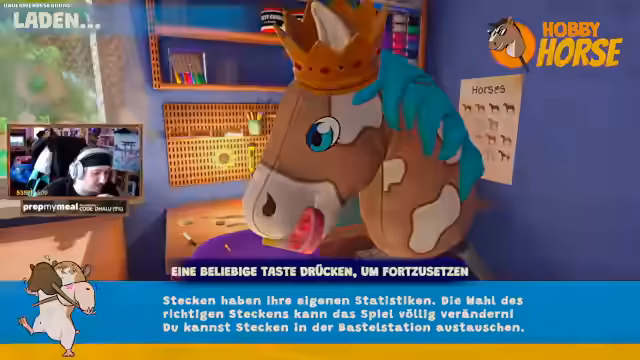 00:00:21Der Stream startet mit Begrüßungen und einer Vorstellung des Spiels 'Hobby Horse'. Der Streamer erklärt, dass es sich um ein offizielles Spiel handelt, bei dem man sein eigenes Steckenpferd anpassen und personalisieren kann. Der Fokus liegt darauf, dass jedes Pferd seinen eigenen Stil haben und gesammelt werden kann. Gleichzeitig wird die Steuerung getestet, wobei anfänglich Probleme mit der Maussteuerung auftreten und daher auf Tastatur umgestellt wird.