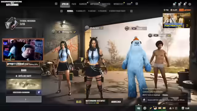 00:43:06Nach mehreren erfolglosen Rekordversuchen im Hobby Horse, wechselt der Streamer zum Spiel PUBG. Er begrüßt sein Team (Terz, Maggie, Kler) und diskutiert über die Wahl der Gruppe für den Squad-Stream. Es kommt zu einem humorvollen Streit über die Leistung in vergangenen Spielen, wobei der Streamer auf seine hohen Schadenszahlen verweist. Die Verlegung des Streams wird kurz angesprochen.
