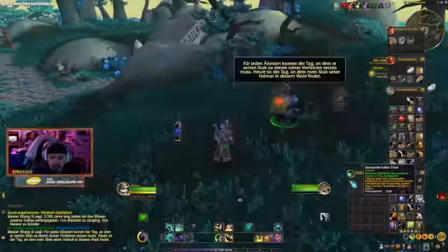 00:00:00Der Stream beginnt, und die Streamerin spielt einen Pandaren-Mönch in World of Warcraft Retail. Sie ist auf der Panda-Insel gefangen, da sie Level 10 erreichen muss, um das Gebiet verlassen zu können. Der Fokus liegt auf dem Erlernen der grundlegenden Mechaniken wie das Aufleveln, das Sammeln von Gold und Taschen sowie das Verständnis des Spiels für einen Einsteiger.
