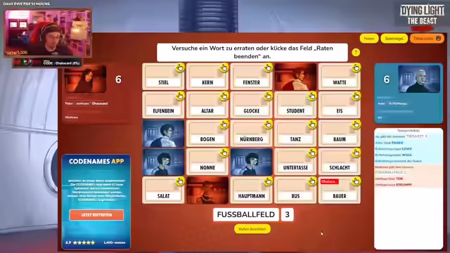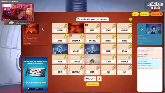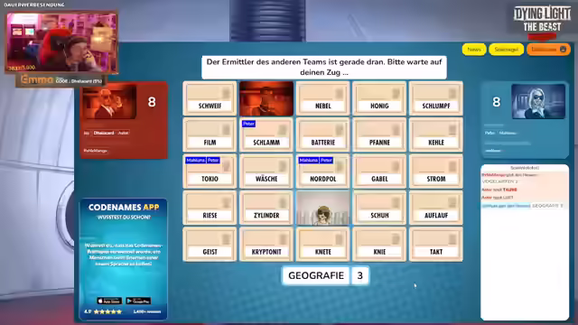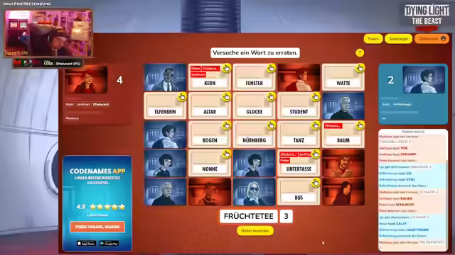 08:21:28Die Diskussion dreht sich um den Begriff "Magnum", wobei Eis und eine Glock als mögliche Assoziationen genannt werden. Die Gruppe entscheidet sich für Eis. Es wird festgestellt, dass der eigene Geheimdienstchef unter Druck gesetzt wird. Ein Fehler wird bemerkt: Der Begriff "Bauer" wurde bereits genannt. Die Gruppe überlegt, was der zweite Begriff für "Schach" sein könnte, und entscheidet sich schließlich für "Bauer", obwohl es riskant ist. Es stellt sich heraus, dass beide Begriffe richtig waren. Jay erhält den Hinweis, etwas "richtig Geiles" auszupacken, da die Gruppe nun vier Begriffe benötigt. Er gibt den Hinweis "Caesar Salad", was zu Überlegungen über Hauptmänner und Bögen führt. Die Gruppe entscheidet sich für "Salat", da es am sichersten erscheint. Es wird diskutiert, ob man raten oder auf einen besseren Hinweis warten soll, da die Wörter schwierig zu verbinden sind. Jay gibt den Hinweis "Früchte-Tee", was zu Assoziationen wie Kern, Untertasse und Baum führt. Nach langem Überlegen entscheidet sich die Gruppe, "Nürnberg" zu wählen, was sich als das schwarze Feld herausstellt. Es wird diskutiert, ob es doch eine Verbindung zwischen Tee und Glocke gibt, nämlich eine Früchteglocke.