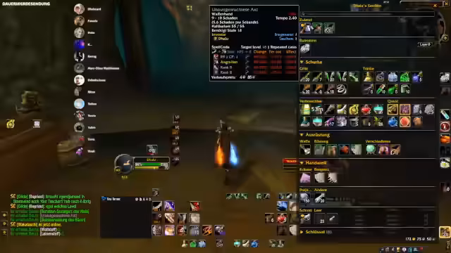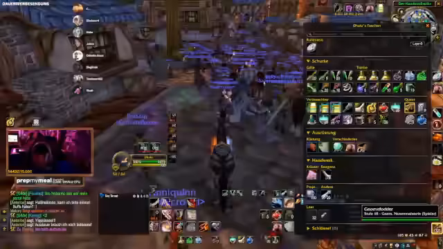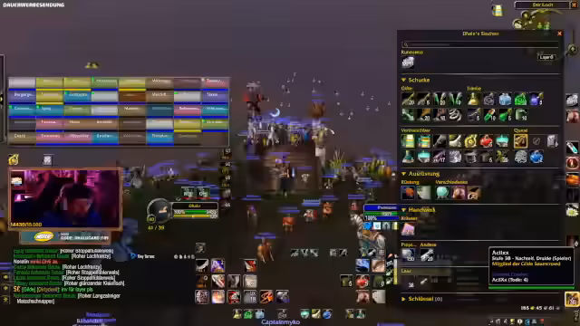 01:20:02Der Streamer fragt nach der Ausrüstung von Gruppenmitgliedern, wie Hosengrößen und Pet-Optionen, und diskutiert, welches Gear besser ist. Es geht um das Verzaubern von Gegenständen und das Aufteilen von Loot, einschließlich der Diskussion über Gyros und Handel auf Madeira. Der Streamer erwähnt den Dunkelmond-Jahrmarkt auf Madeira und spricht über Hannes, der nicht geholfen hat, was zu einer Diskussion über Marktfahrten und Gruppenorganisation führt. Die Gruppe plant, Runden zu spielen, hat aber Bedenken wegen eines Caster-Mobs.