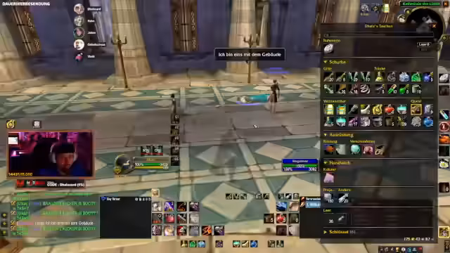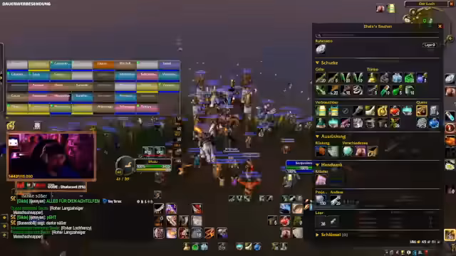 04:38:20Zahlreiche Community-Mitglieder und Team-Teilnehmer organisieren praktische Unterstützung. Der Streamer koordiniert Buff-Termine (z.B. um 15 Uhr und 19 Uhr), verteilt Gold, gibt Portale nach Stormwind oder Booty Bay und hilft bei der Beschaffung von Taschen und Ausrüstung. Ein Fokus liegt darauf, den Wiedereinstieg zu erleichtern, indem zwölf Buffs für neue Charaktere und Gold für Early-Game-Verpflegung bereitgestellt werden. Der Streamer betont, dass die Gilde zusammenhält und alle gemeinsam die Herausforderung meistern.