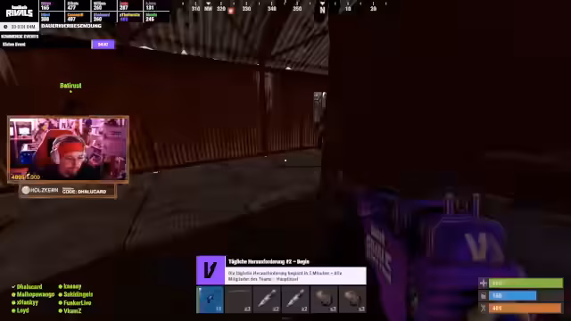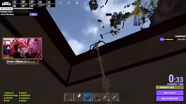 08:50:49Der Streamer erlebt intensive Kämpfe gegen Ballons auf der Rivals-Insel, die als größte Scheiße und größte Lusch bezeichnet werden. Dabei kommt es zu technischen Problemen, da er sich in einer unsichtbaren Wand fängt und sich weder bewegen noch schießen kann. Auch Teammitglieder sind betroffen und sterben durch diese Kollision. Der Streamer ist frustriert über das clunky Movement im Spiel und die ständigen Ballon-Attacken, die das Spiel langweilig machen.