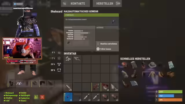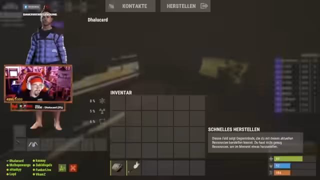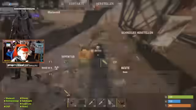 00:02:10Der Streamer farmt aktiv Ressourcen wie Leder, Schusswaffenmunition und Fraktionen. Es werden strategische Überlegungen angestellt, ob es sich mehr lohnt, Tunnel zu graben, um an S-S-S-Buddys zu gelangen, oder Straßen zu bauen für Stoff-Komponenten. Die Gruppe überlegt, eine Kettensäge mitzubauen und plant einen gemeinsamen Farmtrip in der Gegend.