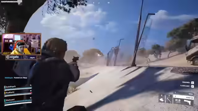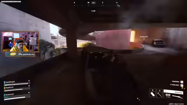 02:50:31Nachdem der Streamer einen Schlüssel und einen Toaster gefunden hat, löst das Team den PvP-Part aus. Es kommt zu einem heftigen Gefecht, bei dem der Gegner geschickt positioniert ist und versucht, das Team auszuschalten. Der Streamer kann einen Gegner eliminieren, sein Teamkollege Suki jedoch stirbt. Der Streamer nutzt einen Zip-Line, um zu flüchten, wird aber von einem Gegner gesichtet und muss sich um Positionen und Rückzugsmöglichkeiten kümmern, während er droht, überwältigt zu werden.