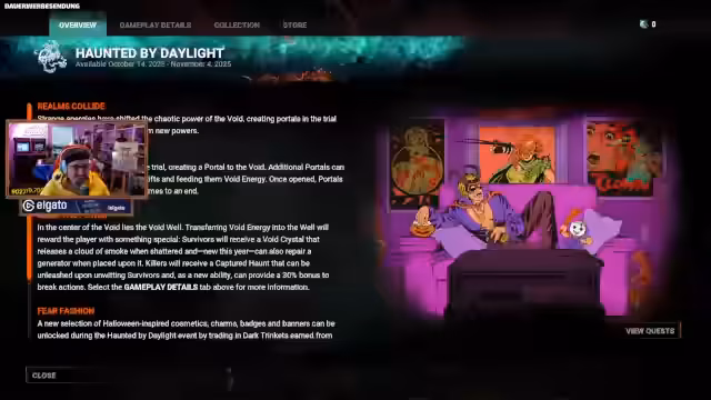 03:20:21Der Stream wechselt zu Dead by Daylight und startet ein Halloween-Event. Die Lobby ist mit anderen Spielern und speziellen Halloween-Kostümen gefüllt. Das Team erhält neue, event-spezifische Loadouts und Perks, die ihre Standardstrategie ändern. Sie diskutieren über die Auren-Zellen, die sie im Event gesammelt haben und wie sie diese für neue Skins und Gegenstände nutzen können.