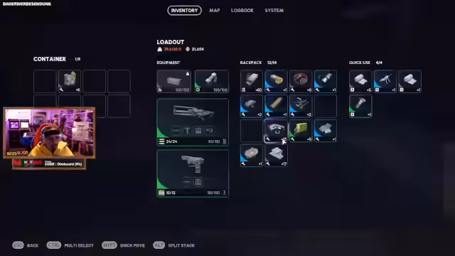 08:47:22Die Runde endet erfolgreich, als eine Bierkiste gefunden und geöffnet wird, die einen Bauplan enthält. Der Streamer nutzt die Zeit am Ende des Runs, um noch verstreute Ressourcen wie Kabel und Munition zu sammeln. Es folgt eine kritische Bewertung der eigenen Leistung, bei der anerkannt wird, dass zu viel Munition verschossen und zu wenig mitgenommen wurde, was die Effizienz für zukünftige Runs verringert.