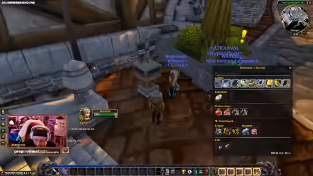 00:32:41Praktische Probleme bei der Vorbereitung werden erörtert. Die Verteilung der Tränke und Consumables gestaltet sich schwierig, da der Streamer diese nicht alle gleichzeitig im Inventar tragen kann. Die Verteilung erfolgt daher über den Briefkasten, was als 'insanes Jonglieren' beschrieben wird. Man diskutiert die Nutzung von World Buffs und die Farm-Aufgaben für die Mats. Ein weiteres Problem ist die unklare Rolle der Heiler, insbesondere die mögliche Trennung von Buffs, was die Organisation komplexer macht.