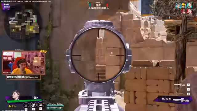 02:10:34Das neue Spielverhalten ist geprägt von Wettbewerb und Frustration. Der Streamer, der anfangs Schwierigkeiten hat, sich auf die 4K-Auflösung einzustellen, versucht, seine Kills zu steigern, um seine Wette gegen Dalu zu gewinnen. Es kommt zu emotionalen Reaktionen; Kampfspiele machen ihn sauer, und er wirft Mitspielern Backseat Gaming vor, also unnützes, von oben herab kommendes Ratschlagen. Er testet neue Waffen und Fähigkeiten, wie das Dämonenauge, und versucht, strategisch Vorteile zu erlangen, während sein Team die Verteidigung der Map übernimmt.
