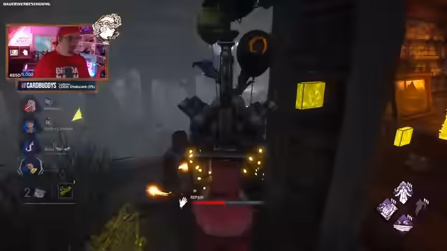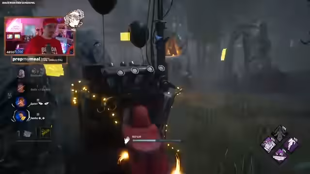 05:18:30Der Stream wechselt abrupt von Mario Kart zu Dead by Daylight. Die Streamer organisieren ein 1-v-1-Wettkampf-Event, bei dem es darum geht, als Killer (Femme) einen Survivor (Femba) in kürzester Zeit zu besiegen. Es werden Strategien besprochen, Perks und Addons ausgewählt und die Stimmung ist geprägt von einem ernsteren, wettbewerbsorientierten Charakter. Die Teilnehmer verfolgen persönliche Bestzeiten und diskutieren über die Leistung und mögliche Unfairness.