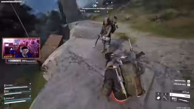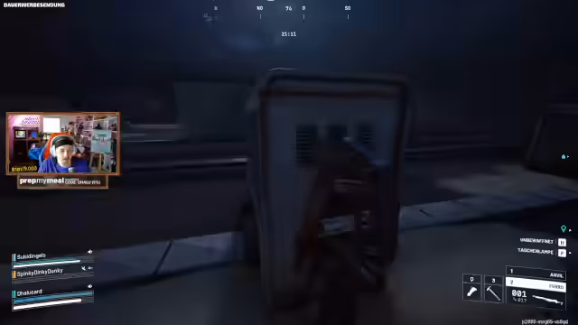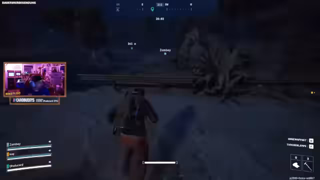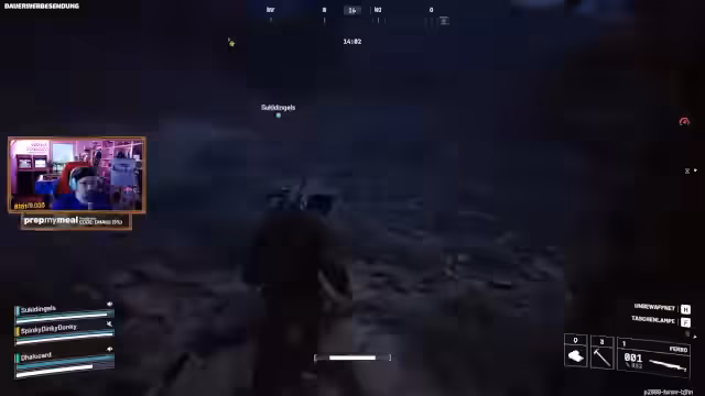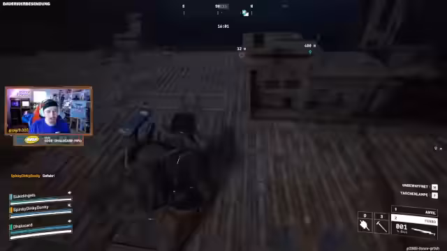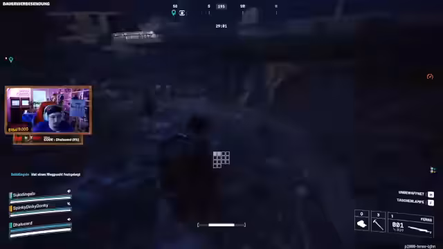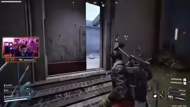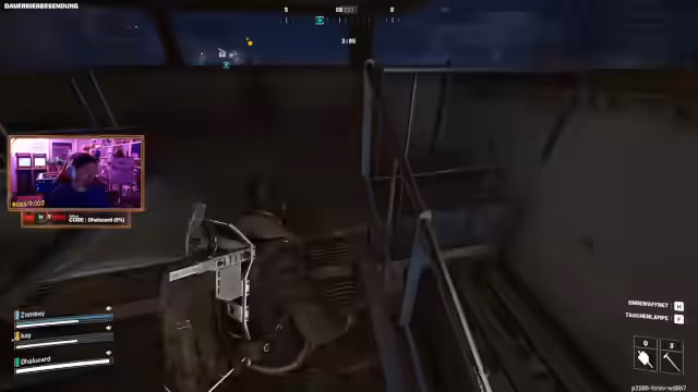 09:11:59Die Gruppe entdeckt eine neue Zipline und versucht, einen verschlossenen Bereich zu erreichen, der eine Keycard erfordert. Es wird spekuliert, ob man mit einer Zipline durch ein Fenster in den Raum gelangen kann, was jedoch nicht sofort gelingt. Während der Erkundung geraten die Spieler erneut in Schwierigkeiten, als sie von Gegnern angegriffen werden und Dhalucard fast ausgeschaltet wird. Trotz der Gefahr gelingt es ihnen, die Situation zu meistern und weiterzuleben, wenn auch mit geringen Heilmitteln. Die Spieler tauschen Bandagen und Crafting-Materialien aus, um sich gegenseitig zu unterstützen. Ein Schild wird gefunden, was die Überlebenschancen erhöht. Die Gruppe zieht weiter, um den Tunneleingang zu finden, der sie zu einem anderen Teil der Karte führen soll, wo sie weitere Questziele erreichen können. Die Suche nach einem Ventil wird ebenfalls fortgesetzt, wobei der Chat um Hilfe gebeten wird, um dessen Standort zu identifizieren. Die Spannung bleibt hoch, da die Spieler jederzeit auf weitere Gegner treffen könnten.