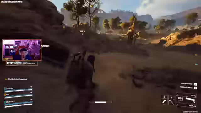 04:53:44Im Verlauf des Streams wird intensiv geplündert und gekämpft. Die Streamer looten viel Muni, Katzenbetten, Spieluhren und Toastern. Sie versuchen, eine Spinne zu besiegen, wobei einer von ihnen fast voll ist. Nach einem Kampf, bei dem ein Team-Kamerad ausgeschieden ist, sammeln sie weiter Loot und treffen auf feindliche Spieler, in einem kurzen und unkoordinierten Gefecht.
