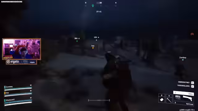 08:27:27Die Spieler experimentieren weiter mit den In-Game-Voice-Filtern. Kay's weibliche Stimme im Spiel wird als besonders überzeugend empfunden, während Zombey's Stimme eher wie die eines kleinen Jungen klingt, obwohl er eine tiefe Einstellung gewählt hat. Die allgemeine Begeisterung für die Voice-Filter bleibt bestehen, da sie als Bereicherung für das Spielerlebnis empfunden werden. Währenddessen werden die Spieler unerwartet unter Beschuss genommen. Die Angreifer verfolgen sie, und die Situation wird kritisch, da einige Teammitglieder schlecht ausgerüstet sind und kaum Gegenwehr leisten können. Es entsteht eine chaotische Flucht, bei der die Spieler versuchen, sich zu heilen und den Verfolgern zu entkommen. Die mangelnde Bewaffnung erschwert den Kampf erheblich, und die Hoffnung liegt darin, dass die Angreifer überladen sind oder ihre Ausdauer verlieren. Die Kommunikation im Team ist entscheidend, um die Bedrohung zu meistern und einen sicheren Fluchtweg zu finden.