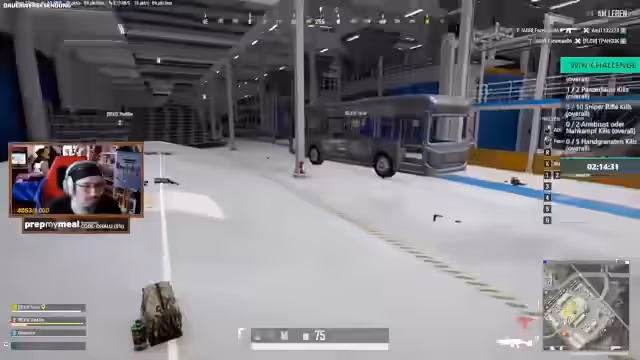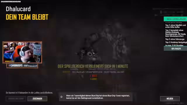 01:14:26In der letzten Phase kämpft das Team um den Sieg, wobei sie sich in der Zone bewegen müssen, um zu überleben. Der Streamer und sein Team haben keine Medkits, was die Situation erschwert. Es kommt zu mehreren Firefights, wobei das Team trotz der schwierigen Bedingungen versuchte, gegnerische Spieler auszuschalten und in das Auto zu gelangen. Die Runde endet damit, dass der Streamer letztendlich stirbt, aber das Team Top 3 erreicht hat.