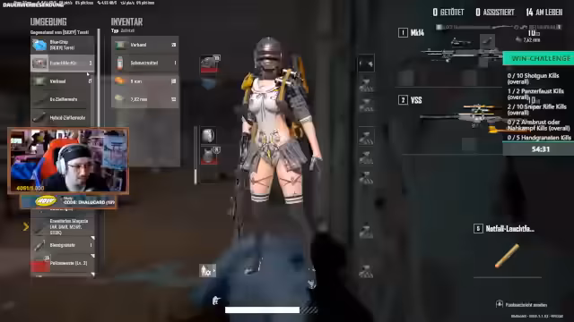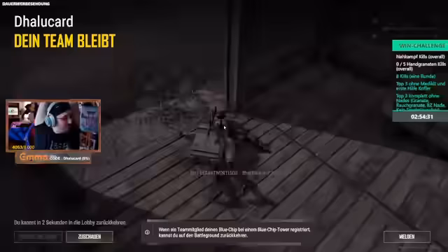 00:52:57In der späteren Phase des Streams konzentriert sich das Gameplay auf das Final-Gehege. Das Team versucht, mit knappen Ressourcen ohne Medikits zu überleben, da ständig Gegner aus verschiedenen Richtungen attackieren. Es gibt mehrere Kämpfe und Taktiken, wobei das Team Top 3 als Erfolg betrachtet. Gleichzeitig wurde der Chat genutzt, um Positionen von Gegnern zu koordinieren und aufeinander aufmerksam zu machen.