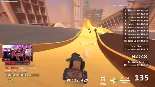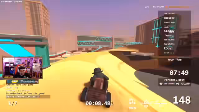 03:23:25Die Spieler nehmen an einem Siebkist-Rennen teil, bei dem die Konkurrenz hoch ist und um die Top 10 gekämpft wird. Es gibt viel Neckerei und Spott unter den Teilnehmern, insbesondere bezüglich der Fahrkünste und der Platzierungen. Parallel dazu wird ein bevorstehendes League of Legends Arena-Turnier erwähnt, bei dem ein Spieler eingeladen wurde, obwohl er keine Ranglistenspiele mehr spielt. Die Aussicht auf ein Turnier mit einem Preisgeld von 100.000 Euro motiviert die Spieler, sich intensiv vorzubereiten, obwohl die RNG-Faktoren in Arena als potenzielles Hindernis angesehen werden. Die Siebkist-Rennen werden fortgesetzt, wobei neue futuristische Strecken gefahren werden, die sowohl einfach als auch frustrierend sein können, insbesondere eine „Pausenstrecke“, die ungewollt in der Playlist auftaucht und zu Weltrekorden auf einer unbefahrenen Strecke führt.