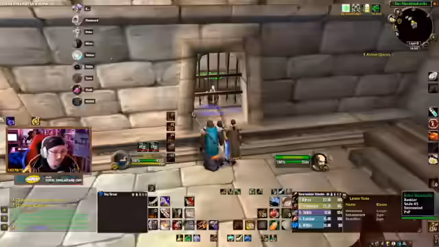 08:23:01Es wird die Kooperation für das gemeinsame Dungeons gehen besprochen. Der Streamer äußert seine Freude, denn er möchte alle Abläufe einmal erklärt haben, um danach sicher als Tank agieren zu können. Als sehr erfahrene Spieler werden die Anwesenden bezeichnet, was das Vorhaben erleichtern soll. Geplant ist ein Einsatz im Tor und Blade Schulden, wobei der Streamer betont, dass es sicher gespielt werden muss, da sie weit vom Flugpunkt entfernt sind und in ein Gebiet mit 62er Elite-Mobs hineingesprungen sind.