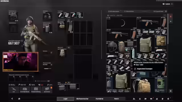 07:18:47Nach dem erfolgreichen Raid beschäftigte sich der Streamer mit der Organisation seiner Beute. Er tauschte seine Ausrüstung aus und kümmerte sich um die Munition. Er versuchte, Magazine über das Tagesangebot zu kaufen, was aufgrund von Systemverzögerungen nicht sofort funktionierte. Es wurde auch die Frage aufgeworfen, ob man in Runden Hunger und Durst verwalten muss, woraufhin der Streamer feststellte, dass dies im Spiel nicht der Fall ist.