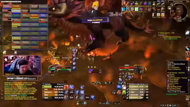 04:58:05Der Streamer beginnt mit dem Onyxia-Raid nach der Vorbereitung. Nach dem Pull des ersten Bosses kommt es zu technischen Problemen und einem Wipe, der auf eine Fehlkoordination zurückzuführen ist. Der Streamer analysiert den Fehler, gibt Hinweise für den nächsten Versuch und startet den Raid neu.