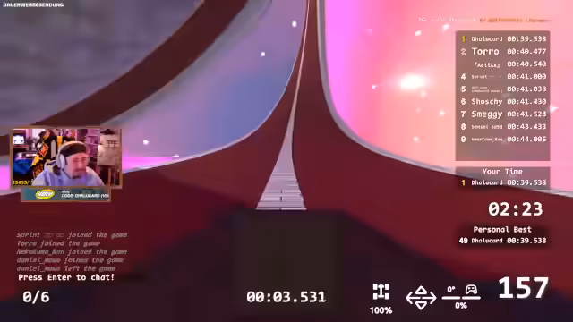 05:47:27Die Diskussion konzentriert sich auf spezifische Spielmechaniken wie das Überwinden von Eisabschnitten, die als extrem rutschig und schwierig beschrieben werden. Der Streamer reflektiert über seine eigenen Zeiten im Vergleich zu anderen Spielern, insbesondere zu einem Spieler namens Asics, und äußert seine Genugtuung, ihm immer wieder nahe zu kommen oder ihn zu besiegen. Er analysiert auch die Rangliste und debattiert, ab wann man als „Bottomfragger“ gilt, wobei er eine klare Hierarchie im Leistungsniveau der Spieler feststellt.