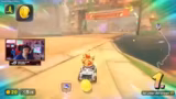 00:00:43Zu Beginn des Streams werden die Zuschauer herzlich begrüßt. Der Streamer beschäftigt sich mit den neuen Spielmechaniken von Mario Kart World und kommentiert seine Rennen, bei denen er sich im Mittelfeld oft ungerecht behandelt fühlt. Er kritisiert die Itemverteilung bei 24 Spielern, da die im Mittelfeld positionierten Fahrer kaum sinnvolle Items erhalten und so fast chancenlos sind. Trotzdem zeigt er sich begeistert von den neuen Abkürzungsmöglichkeiten, die mit der Feder auf bestimmten Strecken möglich sind.