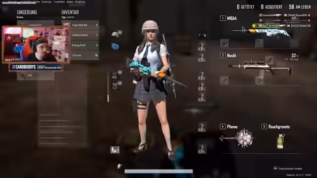 00:01:07Der Stream beginnt mit einer Runde PUBG. Der Streamer plant, einen Skin herzustellen, benötigt dafür jedoch Credits, die er durch Zerlegen von Gegenständen erhält. Es werden Diskussionen über das Bauplan-System, die notwendigen Upgrades und den bevorstehenden Battle Pass geführt. Man einigt sich darauf, zuerst zu spielen, um Dailies zu erledigen und weitere Level zu erreichen. Außerdem wird über die Turnierlogistik und das Finden eines vierten Mitspielers für ein Squad gesprochen, da Toro nicht antwortet.
