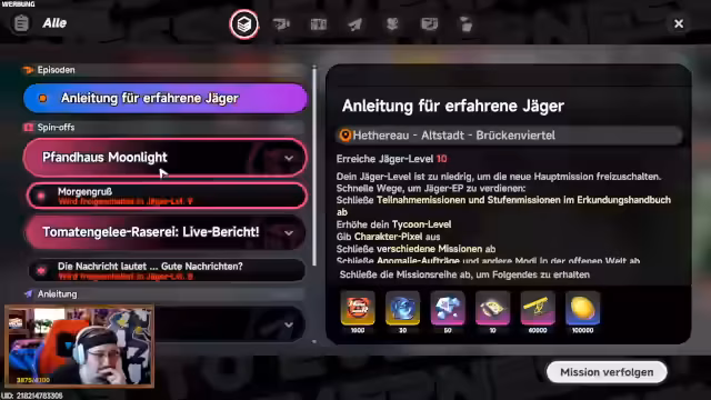 01:32:36Der Streamer gibt aktuelle Informationen zum Spiel bekannt, einschließlich der Verteilung der Voregistrierungsbelohnungen und der anstehenden Events. Er erwähnt den begrenzten Event-Banner, der für zwei Wochen verfügbar ist, und neue Skin-Belohnungen. Er zeigt auch die verschiedenen Menüpunkte wie den Battle Pass und das Jäger-Tagebuch, die wichtige Inhalte für den Spielfortschritt enthalten. Der Streamer betont die Wichtigkeit der tägischen Missionen, um EP für den Jäger-Level zu sammeln.