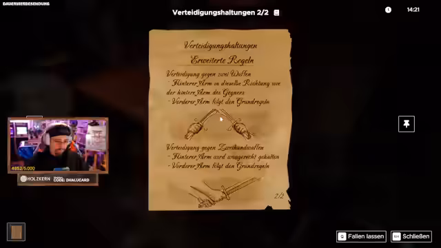 04:07:15Die Streamer stoßen auf ein Rätsel, das die korrekte Eingabe von Schwertkampf-Haltungen erfordert. Sie müssen sich gegenseitig Anweisungen zu Verteidigungshaltungen gegen Kurz- und Langschwerter sowie gegen zwei Waffen vorlesen. Die Regeln sind komplex: Der vordere Arm blockt von oben bei Langschwertern und von unten bei Kurzschwertern. Der hintere Arm reagiert entgegengesetzt zur Bewegung des gegnerischen Arms. Bei zwei Waffen folgt der hintere Arm derselben Richtung wie der des Gegners. Die genaue Interpretation der Anweisungen führt zu Verwirrung, da die Formulierungen wie „von oben blocken“ oder „nach oben blocken“ unterschiedlich verstanden werden können. Nach intensiver Kommunikation und Klärung der Regeln gelingt es ihnen, die korrekten Haltungen einzugeben und das Rätsel zu lösen. Die Erkenntnis, dass das Rätsel einfacher wird, wenn die Regeln klar verstanden sind, ist ein wichtiger Schritt.