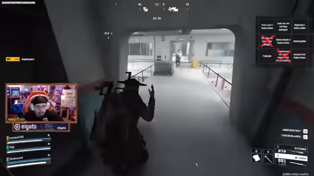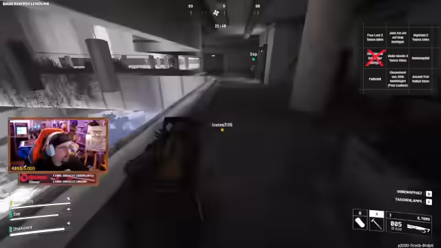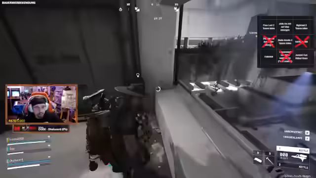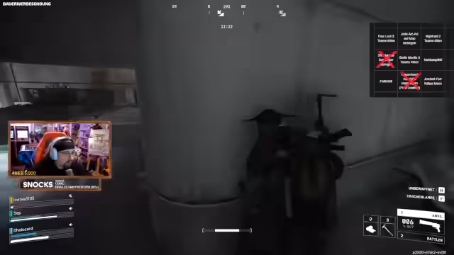 08:29:39Das Team stürmt in den Medical-Bereich, wo sie auf ein Gegnerteam treffen. Ein Gegner wird schnell ausgeschaltet, während ein weiterer versucht zu fliehen. Trotz eines Knockouts auf der Gegenseite gerät das Team in Schwierigkeiten, da der verbleibende Gegner geschickt Granaten einsetzt und sich im Raum verschanzt. Die Kommunikation und Koordination innerhalb des Teams scheinen beeinträchtigt, was dazu führt, dass der Gegner, obwohl er nur ein Freeloadout besitzt, das Team unter Druck setzt. Der Streamer äußert Frustration über die Situation und die scheinbare Ineffektivität seiner Waffe. Es wird diskutiert, wie man solche Situationen besser handhaben könnte, insbesondere durch aggressiveres Pushen, da ein einzelner Gegner mit einem Magazin oft nur ein Schild brechen kann, es sei denn, er besitzt eine Venator 4.