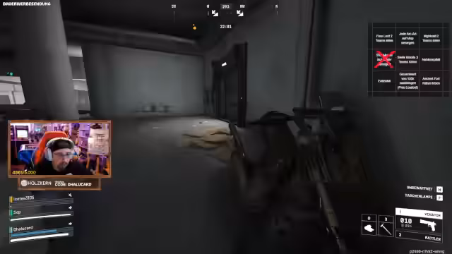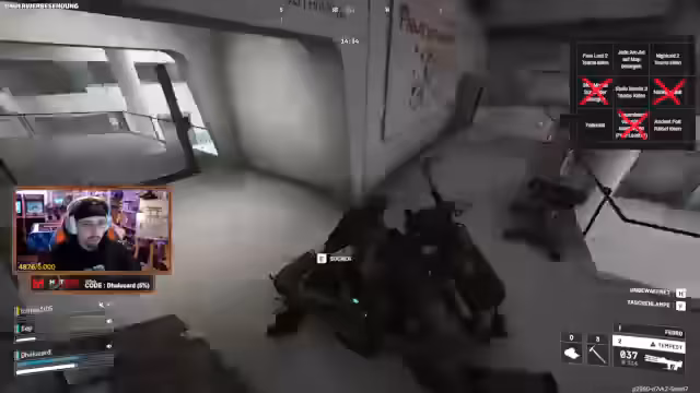 06:58:03Ein intensiver Kampf entbrennt, in dem das Team von Gegnern umzingelt wird. Nachdem Feinde durch eine Tür eindrängen und das Leben des Streamers auf ein Minimum sinkt, gelingt es durch geschickte Manöver und Koordination, die Situation zu retten. Teammitglieder unterstützen sich gegenseitig, um die Angreifer zu neutralisieren und sich aus der bedrohlichen Lage zurückzuziehen, bevor sie ausgeschaltet werden können. Der Einsatz von Spezialwaffen wie der Wolfpack wird erwogen, aber aufgrund der Kosten und des Risikos zunächst zurückgehalten.