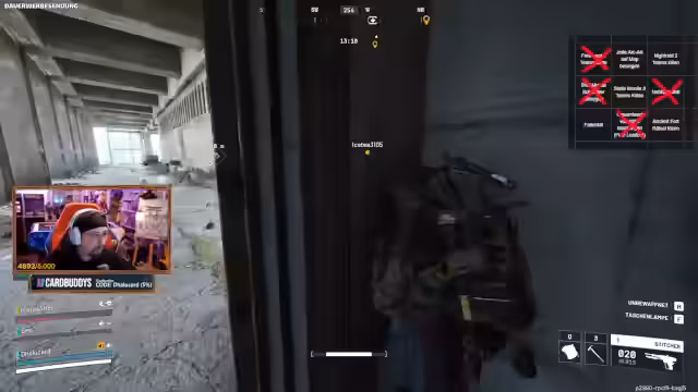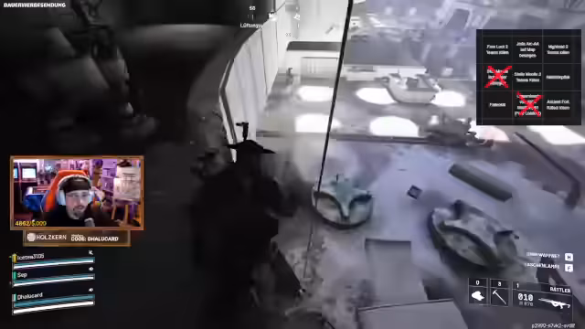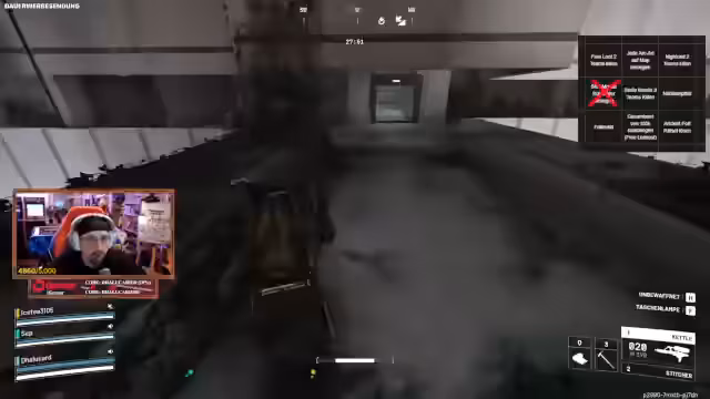 09:00:49Die Fallenjagd am Damm gestaltet sich schwieriger als erwartet, da die Gegner die Fallen nicht auslösen. Das Team versucht weiterhin, die Gegner anzulocken, indem ein Spieler sich exponiert und Schüsse abgibt, um sie in die Nähe der Fallen zu locken. Währenddessen kommt es zu Gefechten auf verschiedenen Ebenen des Damms, wobei ein anderes Team in der Eingangshalle kämpft. Der Streamer und sein Team versuchen, sich in diese Kämpfe einzumischen und die Gegner mit Granaten zu bewerfen. Die Situation ist chaotisch, da mehrere Teams gleichzeitig kämpfen und die Gefahr besteht, von verschiedenen Seiten angegriffen zu werden. Das Team muss sich entscheiden, ob sie den Ausgang vermeiden oder sich den verbleibenden Gegnern stellen.