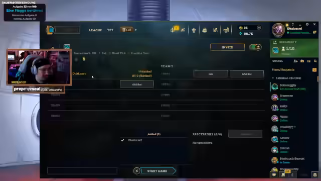 00:00:01Der Stream beginnt mit der Organisation des Warteraums für die Teilnehmer. Es kommt zu technischen Verzögerungen, da der Streamer von starken Lagg-Problemen berichtet, die vermutlich auf sein WLAN zurückzuführen sind. Während der Wartezeit werden bereits die ersten Spielstrategien für den Charakter Graves diskutiert, insbesondere das potentialvolle 'Magic Carpet Dive' Build, das es ermöglicht, den Grabstein in ungewöhnlich hohe Positionen zu platzieren, um Gegner zu überraschen und ihnen den Weg abzuschneiden.