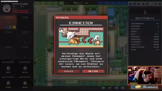 03:07:38Nach dem Abschluss der Deadlock-Runde beginnt der Streamer mit Pokémon Tower Defense (PokéPath TD). Er erklärt die Grundprinzipien des Spiels, darunter das Erreichen von Pokémon im Shop, das Sammeln von Eiern, das Level-Up von Pokémon und den Wechsel zwischen Routen. Das Spiel wird als ein browserbasiertes Tower Defense-Spiel mit RPG-Elementen vorgestellt, bei dem man bis zu 10 Pokémon gleichzeitig einsetzen kann.
