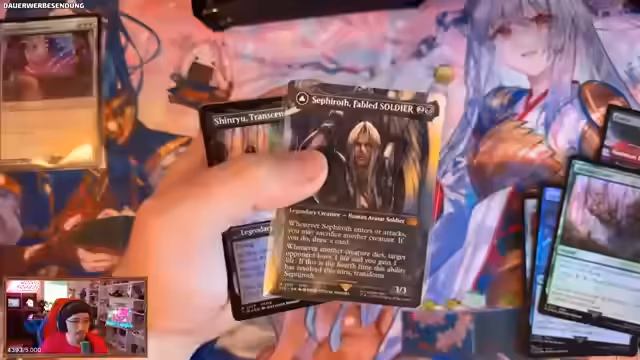 02:20:14Der Streamer startet ein Opening von Magic: The Gathering Karten aus der Final Fantasy Kollektion. Er zeigt und kommentiert exklusive Karten, die er aus Japan oder speziellen Events wie der Dokomi mitgebracht hat, darunter signierte Karten, spezielle Artworks und Turnier-Promos. Das Highlight des Openings ist die Ziehung einer 'Secret Rendezvous'-Karte von Cloud. Diese Karte hat die Besonderheit, dass auf der Rückseite ein anderer Charakter abgebildet ist und es gibt mehrere Versionen davon. Dieses Opening ist der Beginn einer längeren Serie.