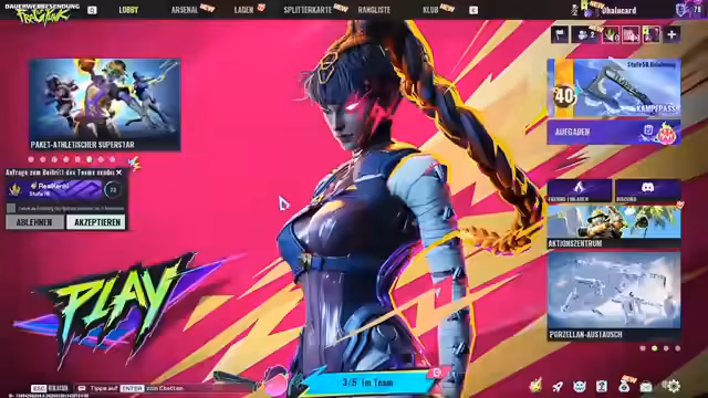 03:55:59Der Streamer richtet sich für Vector Strike ein und lädt seine Mitspieler Dado, Leon und Jen ein. Es werden technische Probleme mit dem Spiel und dem Gruppen-System angesprochen, wodurch das Joinen der privaten Partie zunächst fehlschlägt. Nach einigen Versuchen und der Nutzung eines Tokens gelingt es, die Teams zu bilden und das erste Spiel als 3-gegen-3 zu starten.