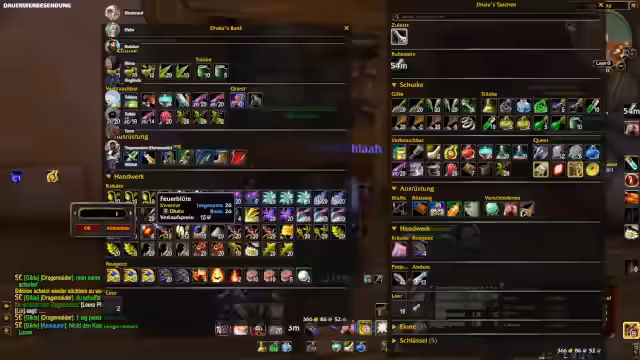 03:11:29Es wird die Suche nach einem Wolfmeister-NPC in Desolace erwähnt, dessen Wolf als Haustier attraktiv wäre. Gleichzeitig wird der Plan, als Hunter für die Gruppe Aale zu fangen, als gute Gelegenheit für schnelles Farmen angesehen. Obwohl kein Interesse an der Todesmine besteht, wird improvisiert, indem man in Westfall Levelt und auf bessere Items hofft. Der Fokus liegt auf dem gemeinsamen Farming von Items für niedrigstufige Gildenmitglieder, wobei die schlechte Verlesbarkeit des Gildenchats und der Vorteil von direkten Whispern zur Item-Verteilung betont wird. Eine detaillierte Quest, das 'Höchstgröner Atta', wird als unbeliebt beschrieben.