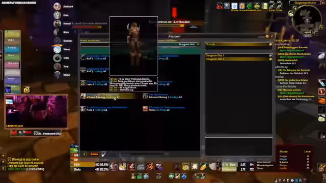 09:21:05Die Streamergruppe hat Schwierigkeiten, den Schlachtzug korrekt einzurichten und zu koordinieren. Nach erfolglosen Versuchen, den Boss zu bezwingen, wird ein weiterer Versuch mit dem Schwert unternommen. Dabei werden Komplimente und Damage-Addons diskutiert. Die Diskussion umfasst auch das Loot von Bossen, wobei ein Spieler wichtige Gegenstände erhält, während andere bedauern, dass bestimmte Items nicht getradet werden können. Ein Spieler erreicht einen 200er Rüstungsset-Bonus und zeigt sich begeistert von den Fortschritten, die er durch verschiedene Ausrüstungsteile erzielt.