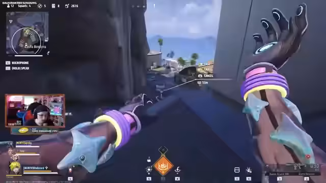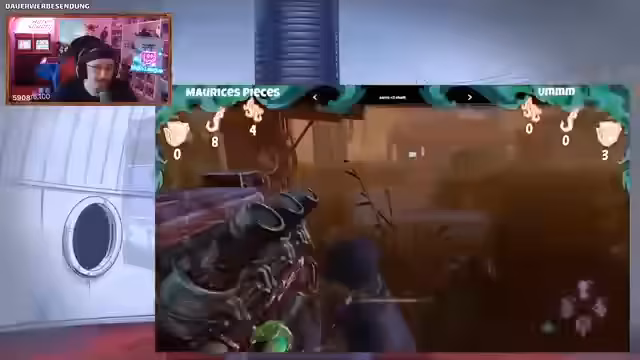 04:10:56Das finale Spiel zeigt ein dynamisches und unvorhersehbares Endgame. Ein Team resset sich über den Streamer, während gleichzeitig ein anderes Team auf einer Brücke kämpft. Es kommt zu einem Triple-Revive-Versuch, der jedoch durch einen gegnerischen Angriff unterbrochen wird. Der Streamer nutzt seine Fähigkeit, durch Wände zu teleportieren, um sich in Sicherheit zu bringen, und eliminiert einen Gegner.