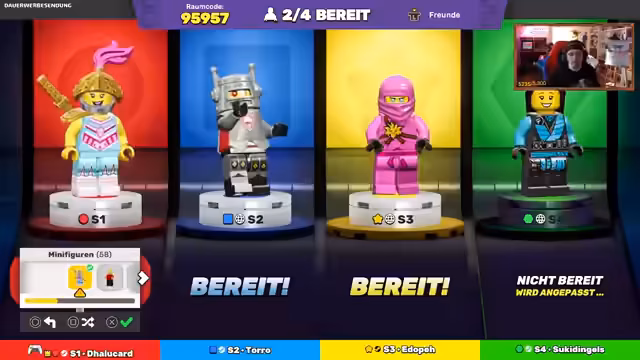 05:55:42Der Streamer startet mit der Charakter-Erstellung in Lego Party, wobei er sich eine eigene Minifigur mit individuellen Gesichtsausdrücken und Accessoires wie Boxhandschuhe gestalten kann. Nach Abschluss der Erstellung übermittelt er den Lobby-Code an die Mitspieler. Es wird eine Diskussion darüber geführt, ob die Lobby versteckt werden soll, was aber letztlich nicht umgesetzt wird, da alle Spieler beigetreten sind.