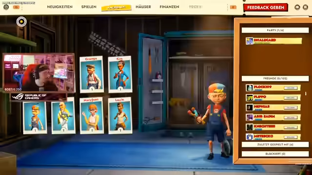 00:24:58Nach Abschluss des Tutorials betritt der Streamer die Spiellobby für ein 4-gegen-4-Spiel. Er überlegt, welches Haus er wählen soll und entscheidet sich für das 'Winter Lodge'. Gemeinsam mit seinem Team wählt er seine Charaktere. Er spielt 'Kevin', eine Figur, die als schlimmes Mitglied der Nachbarschaft beschrieben wird und über Fernkampfwaffen und einen Enterhaken verfügt. Seine Mitspielen übernehmen andere Rollen wie 'Mary Jane' und 'Opa'. Das Team bereitet sich auf das Spiel vor und plant eine Strategie basierend auf den Stärken der gewählten Charaktere.