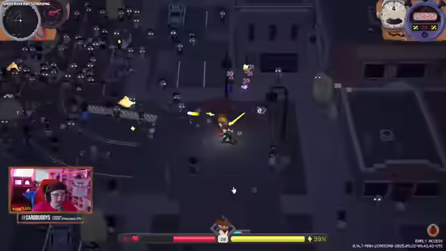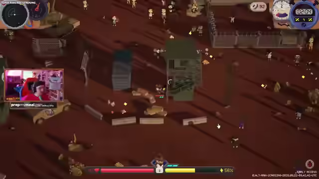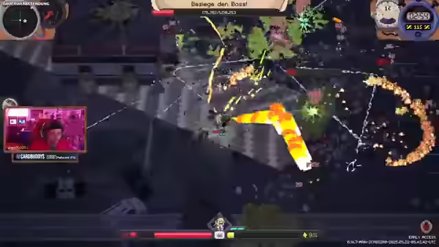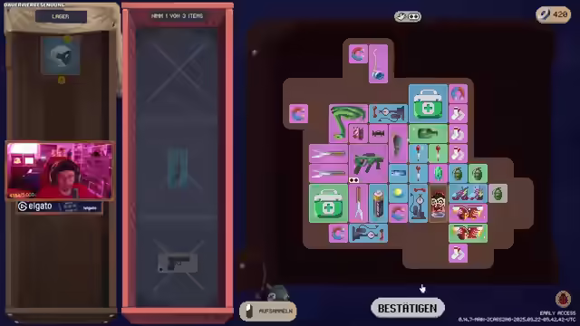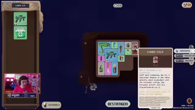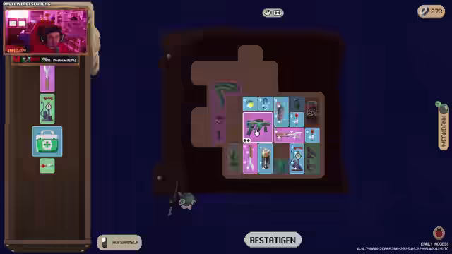 08:35:21Es wird über die Optimierung der Items diskutiert, insbesondere über die Anordnung der Socken und die Verwendung des Magneten. Es wird festgestellt, dass das Jojo noch nicht auf maximaler Reichweite ist und versucht, dies zu korrigieren. Es wird ein Medkit mitgenommen, da dies als wichtig erachtet wird. Es wird ein Staubsauger für das nächste Level gefunden. Es wird festgestellt, dass die ganze Zeit noch eine Waffe mitgenommen werden kann. Es wird überlegt, ob Overheat mehr Schaden macht, sich aber nicht lohnt, wenn man tot ist. Es wird sich über das gefundene Benzin gefreut. Es wird überlegt, ob ein Molotow-Cocktail sinnvoll ist und wo er angebracht werden soll. Es wird ein Kristall unter die Dose platziert und überlegt, ob Dynamit an die zweite Waffe gepackt werden soll. Es wird ein Shop entdeckt und überlegt, ob ein Reroll möglich ist. Es wird überlegt, welche Einhandwaffe gut wäre und sich über die vielen Flaschen gewundert. Es wird festgestellt, dass das Jojo nun auf Max Range ist. Es wird sich über die wenigen Level-Ups gefreut und ein Flummi gefunden. Es wird gepumpt und über Buxtehude noch etwas gelootet. Es wird festgestellt, dass die Map nicht sehr groß ist und es nicht viel Benzin gab. Es wird von zu vielen Gegnern in die Ecke gedrängt.