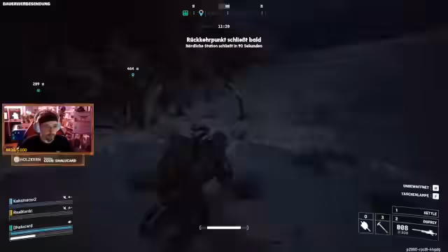08:24:15In den letzten Minuten der Runde unternimmt das Team verzweifelt den letzten Versuch, die Challenge abzuschließen. Man wartet auf das Spawnen der letzten Spinne, während man sich gleichzeitig auf mögliche Gegner vorbereitet. Die Kommunikation ist angespannt und handlungsorientiert. Die Versuche, den Gegner durch Radar-Flares aufzuspüren oder in einem finalen Gefecht zu eliminieren, schlagen jedoch fehl, was den unzufriedenen Abschluss der Runde besiegelt.
