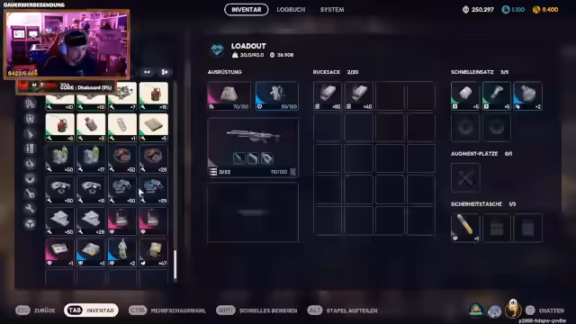 06:19:14Nach einem anfänglich unglücklichen Start mit mehreren Treffern in den Rücken, konnte sich der Streamer im weiteren Verlauf der Runde verbessern und mehrere Gegner eliminieren. Eine Runde endet mit dem Sieg gegen mehrere Gegnerteams. Das Loot der Runde ist sehr ergiebig und umfasst eine große Menge an Waffenteilen, Waffenblaupausen und mehrere Raritäten, was Platz im Inventar und anschließendes Craften neuer Ausrüstung ermöglicht.